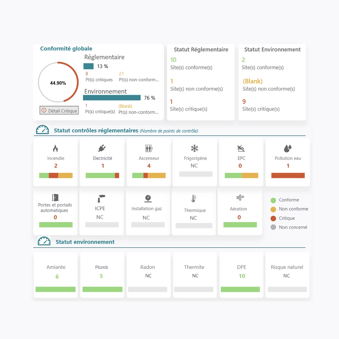 Nous facilitons la mise en conformité des patrimoines immobiliers avec les différentes réglementations (contrôles réglementaires ascenseurs, de sécurité incendie, …), afin de réduire les risques et d’assurer une meilleure maîtrise des obligations légales.